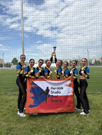 Mladá Boleslav – V neděli 1. června se v hale v Mladé Boleslavi konalo Mistrovství České republiky druhé výkonnostní třídy v gymnastickém aerobiku. Mezi nejlepšími týmy z celé republiky zazářil juniorský tým Aerobik studia Orel Dobříš, který triumfoval ve své kategorii step aerobiku a odvezl si domů zlaté medaile. Pro svěřenkyně trenérky Markéty Vodenkové to bylo již třetí vítězství v řadě, čímž potvrdily svou dominantní pozici na české scéně.